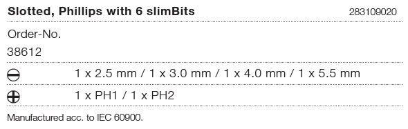 • 隱藏在手把內的批頭收納盒可容納 6 個標準 slimBit 批頭,只需按一下按鈕即可從盒子中拉出。這樣可以輕鬆取出 75 毫米 slimBit 批頭